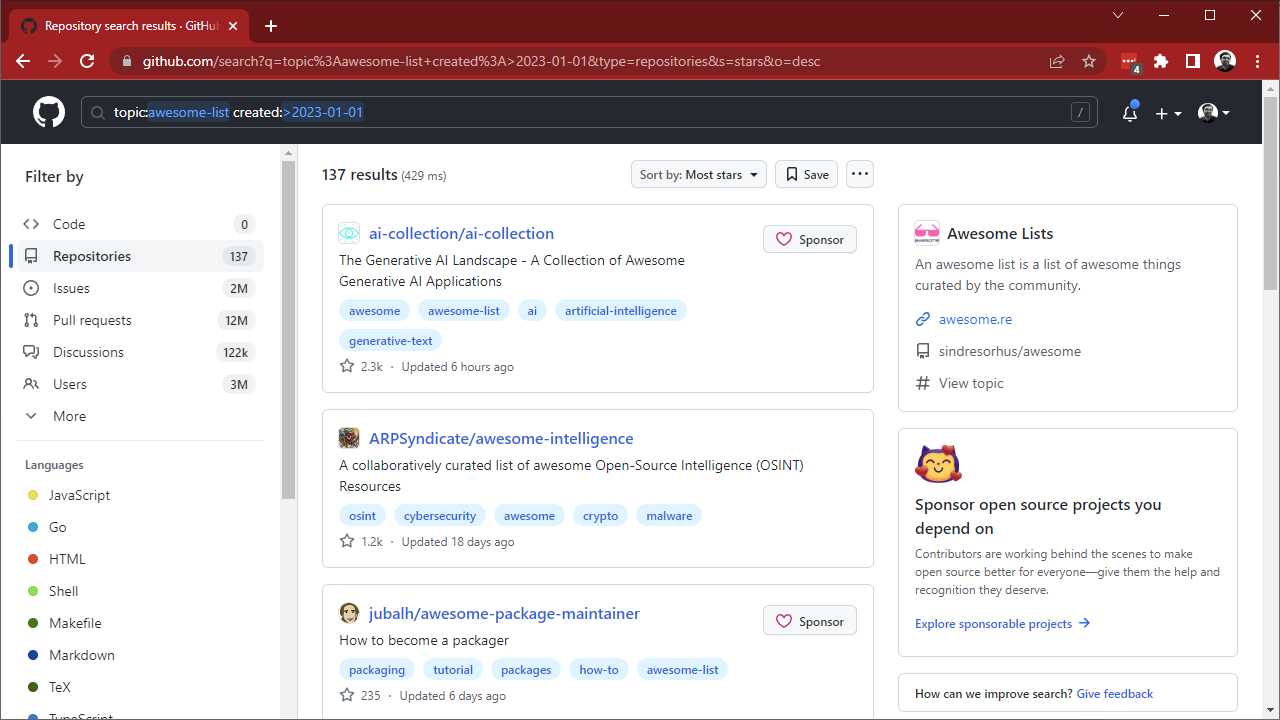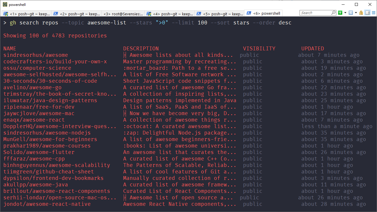 $ gh search repos --topic awesome-list --stars ">0" --limit 100 --sort starsThis search finds 100 repos tagged with awesome-list, filters out no-star repos, and sorts by most stars.