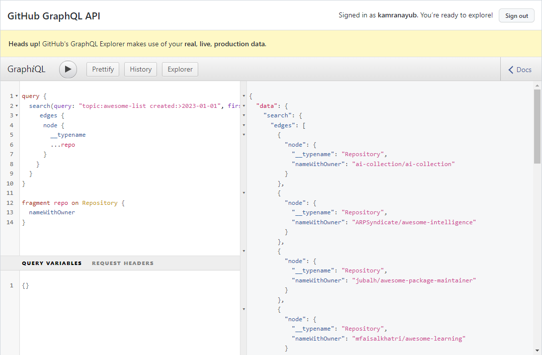 search(query: "topic:awesome-list created:>2023-01-01", first: 10, type: REPOSITORY) {