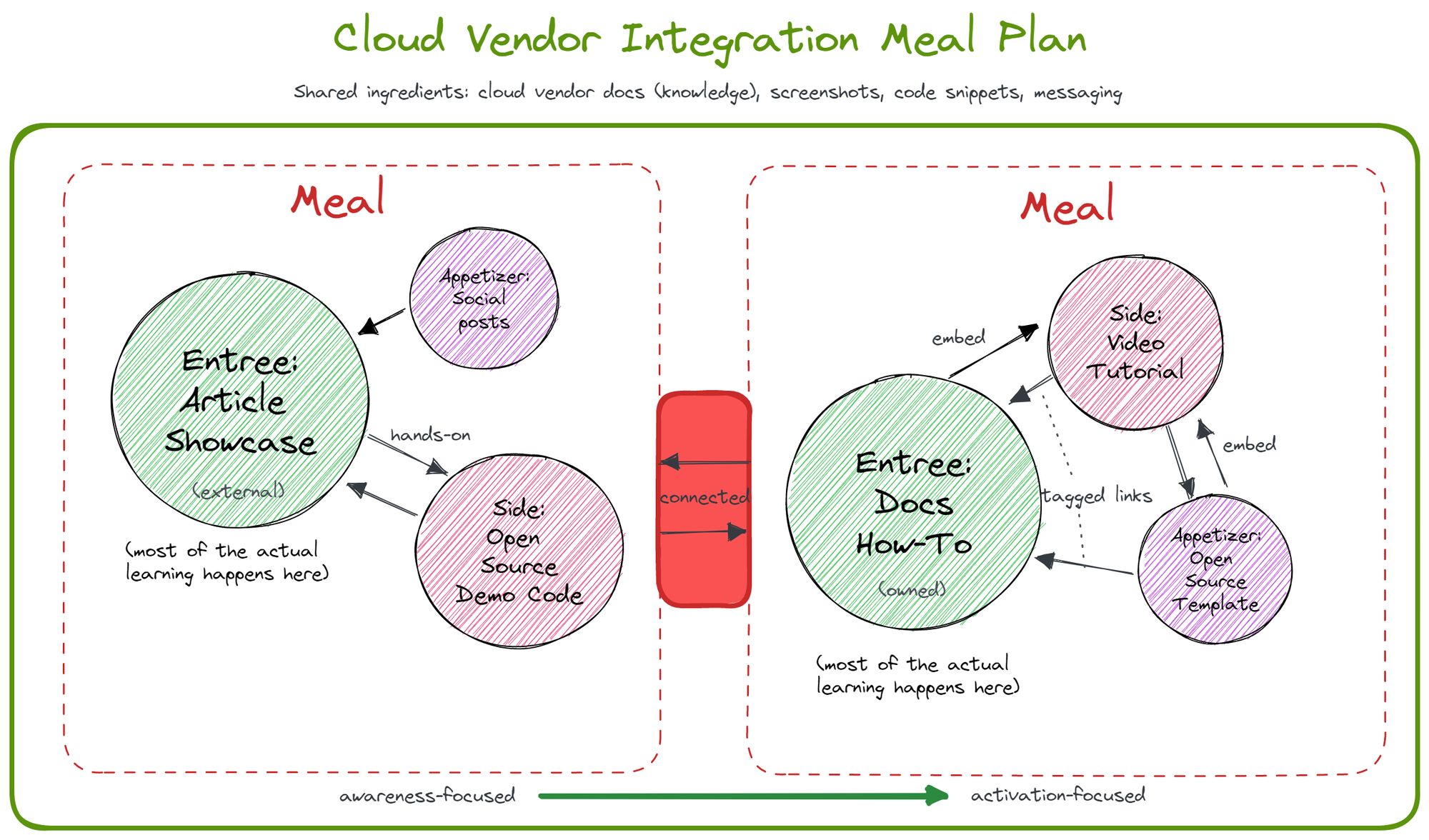 Entrees like the how-to docs guide will take much longer to consume and be more involved than the 5-8 minute video. The GitHub repo might have a README that has more reference-style docs so there's some consumption happening but not to the same extent (otherwise that'd be a big meal). There is this idea of balance and right-sizing meals, and deciding what meals might share ingredients with each other. Not shown here are the other two cloud integrations – but they can share similar ingredients like structure/planning but maybe won't share knowledge (one cloud vendor's docs !== the other's).