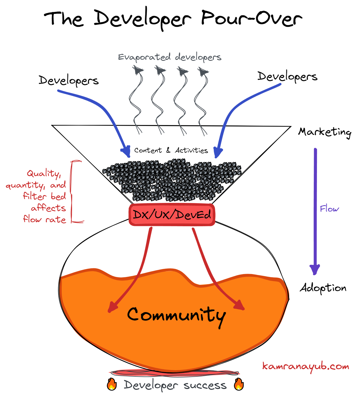 Then, the awareness attracts developers and they are poured-over. They percolate in your activities. They pass through your developer experience (DX), user experience (UX), and educational material like docs or courses (DevEd).