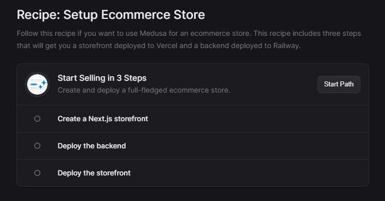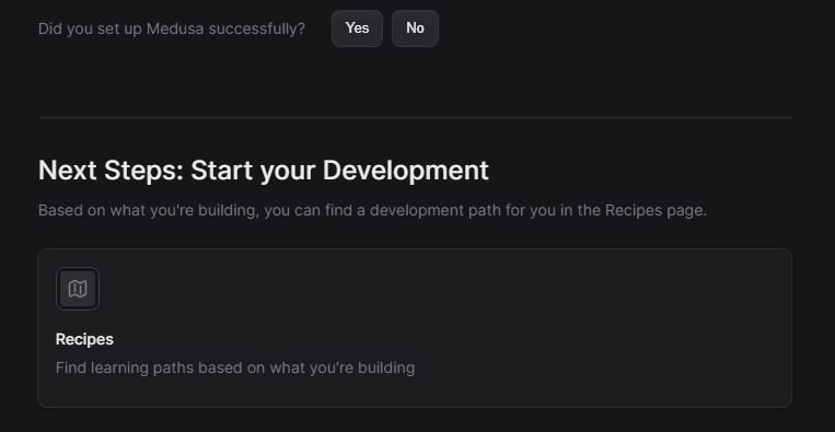 Once you get past the getting started tutorial ("Time to hello world"), the next step is to get something done ("Time to value"). At the end of the getting started guide, Medusa directs developers to their Recipes page: