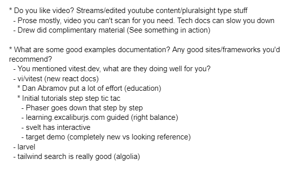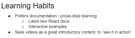 One example someone shared was learning React. They said they really liked the new React docs, especially the interactive examples. BOOM. That's a helpful data point. They said they definitely prefer "prose style" content like documentation and see videos as a way to get a quick introductory overview to "see it in action" (their words). For context, this was a senior React developer.