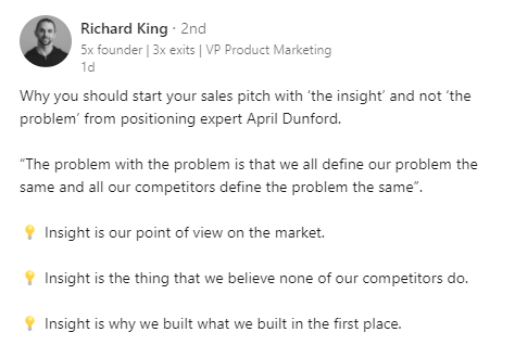 This week was the Product Marketing Summit, and Richard, the CEO, posted a clip of April Dunford's talk related to her new book, Sales Pitch.